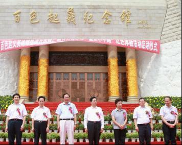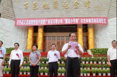 6月28日下午,百色市百色起義紀(jì)念館廣場紅旗招展,紅歌激揚,百色起義英雄雕塑園開園暨廣西百萬青少年“重走小平路”紅色體驗活動啟動儀式在這里隆重舉行。廣西自治區(qū)黨委書記、自治區(qū)人大常委會主任郭聲琨出席儀式,并與自治區(qū)黨委副書記陳際瓦,自治區(qū)黨委常委、秘書長余遠(yuǎn)輝一道,共同為團(tuán)干部、青聯(lián)委員、青年文明號集體代表、少先隊員等青少年“重走小平路”團(tuán)隊代表授旗,陳際瓦宣布百色起義英雄雕塑園開園、“重走小平路”紅色體驗活動啟動,嘹亮的軍號響徹廣場上空,正式拉開了“重走小平路”紅色體驗活動的序幕。