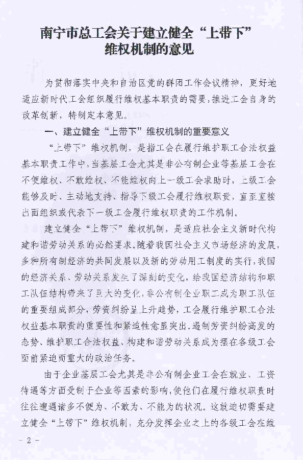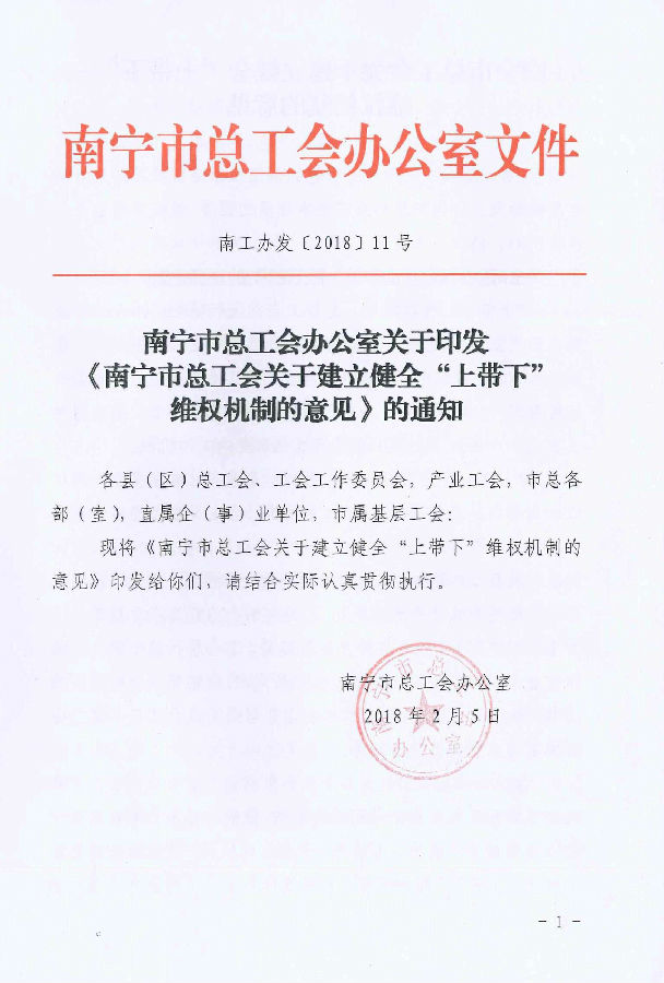 南寧市總工會(huì)辦公室關(guān)于印發(fā)《南寧市總工會(huì)關(guān)于建立健全“上帶下”維權(quán)機(jī)制的意見(jiàn)》的通知