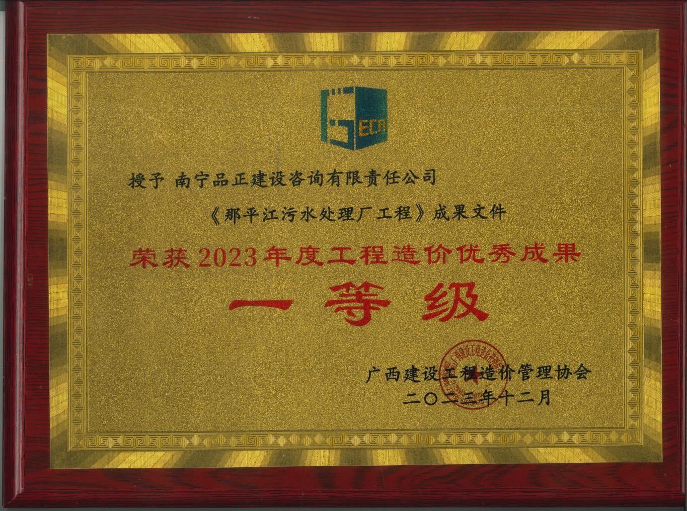 2023年12月18日,我公司“那平江污水處理廠工程全過程工程造價咨詢成果”獲得2023年度廣西建設工程優(yōu)秀造價成果一等獎。