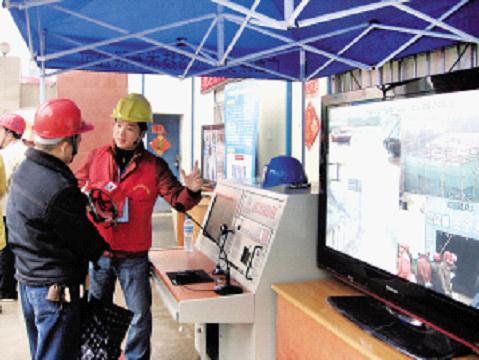 參觀者向工作人員了解“標準化”工地的現(xiàn)場監(jiān)控操作