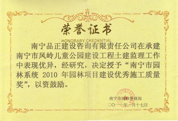 2011年1月17日,南寧品正負(fù)責(zé)監(jiān)理的南寧市鳳嶺兒童公園建設(shè)工程榮獲南寧市園林管理局頒發(fā)的“南寧市園林系統(tǒng)2010年園林項(xiàng)目建設(shè)優(yōu)秀施工質(zhì)量獎”。